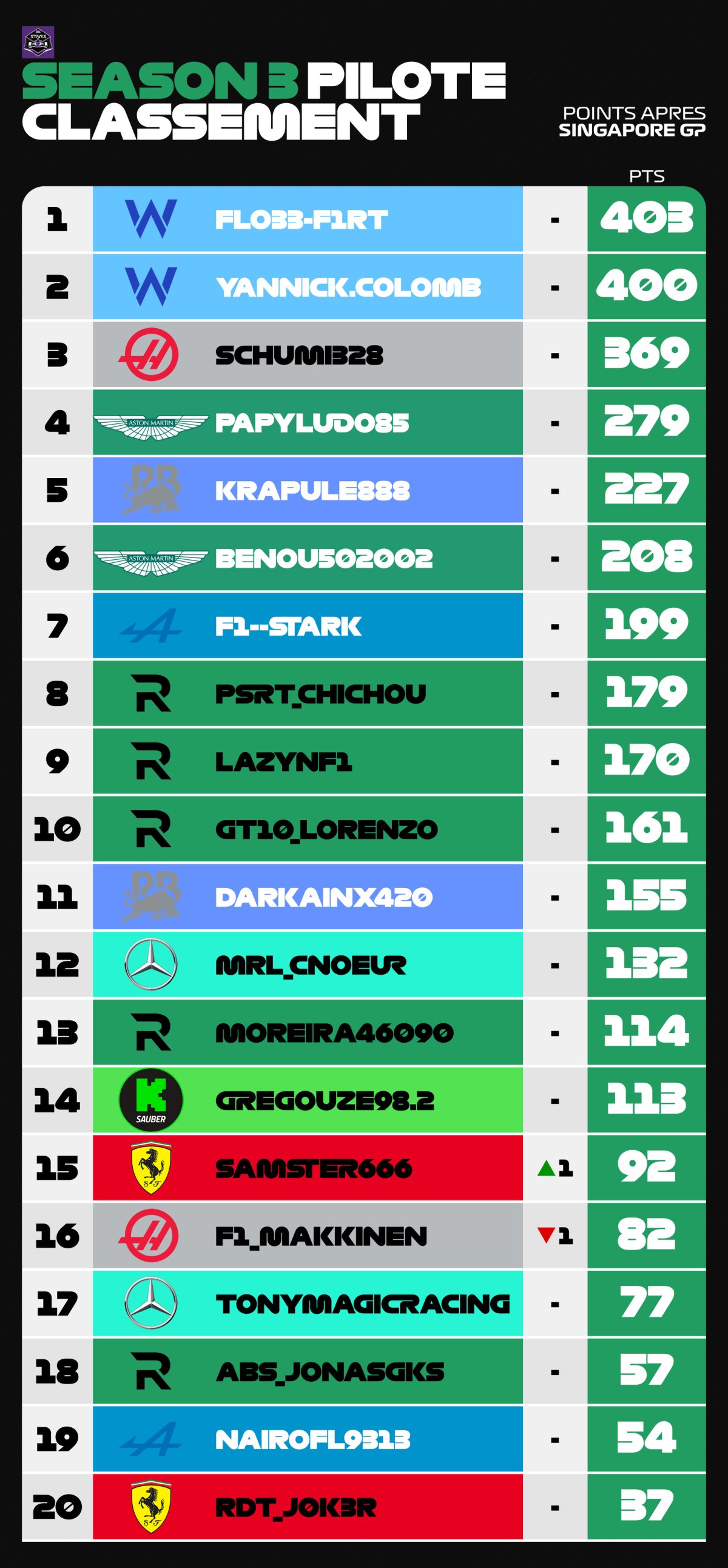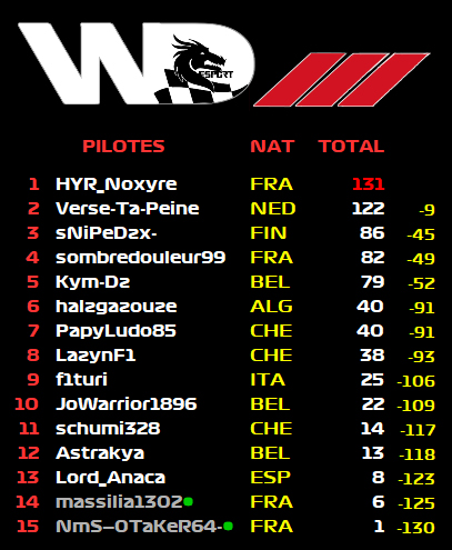 🥉 schumi328 🇨🇭 = 345 pointsP4 PapyLudo85 🇨🇭 = 259 pointsP14 Gregouze98 🇨🇭 = 113 points