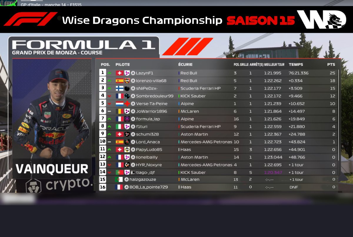 - Hier soir avait lieu la 14ème Manche du Groupe F1 de la Wise Dragons avec le GP de Monza 🇮🇹
