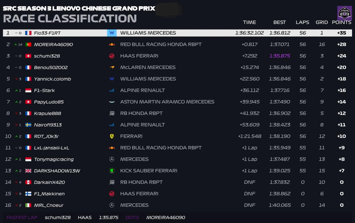 📑 Hier soir avait lieu la 2ème Manche de Saison 3 de la SRC avec le GP de Chine 🇨🇳