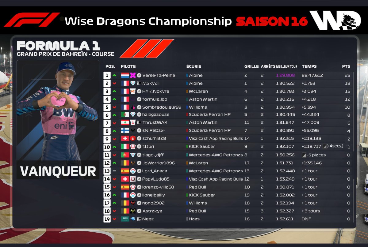 📑 Mercredi soir avait lieu la 4ème Manche de cette Saison 16 du Groupe F1 de la Wise Dragons avec le GP de Bahreïn 🇧🇭