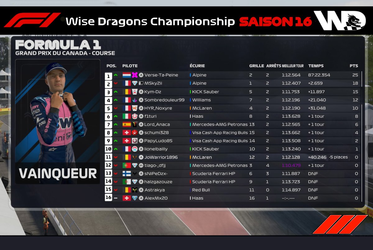 📑 Mercredi soir avait lieu la 10ème Manche de cette Saison 16 du Groupe F1 de la Wise Dragons avec le GP du Canada 🇨🇦