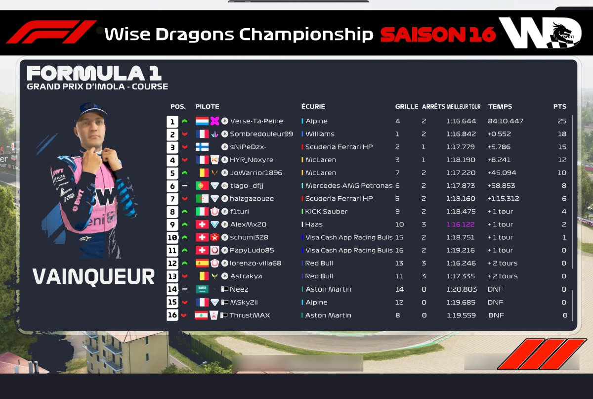 📑 Hier soir avait lieu la 7ème Manche de cette Saison 16 du Groupe F1 de la Wise Dragons avec le GP d'Imola 🇮🇹